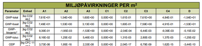 I en EPD er GWP angivet for de deklarerede livscyklusmoduler for et produkt. For at opgøre og dokumentere klimapåvirkningen for produktet, skal data fra modul A1-A3, A4, C3, C4 og D anvendes, jf. § 297, stk. 4.